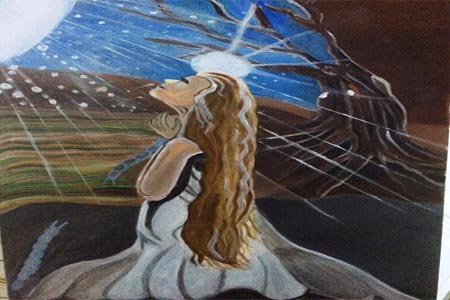 افراسيانت - بقلم: زياد جيوسي - في لوحة الفنانة سحر العزام، نجد أمامنا عملاً فنياً بسيطاً، ولكنه من جانب آخر يحمل فكرة كبيرة، فلو نظرنا للوحة، وهي لوحة مرسومة بشكل طولي، لوجدنا أن موضوع اللوحة والجانب الوصفي العام يتركز على فكرة واحدة هي الرجاء، وهي عملية قائمة على الدعاء لله سبحانه وتعالى، وعلى مجموعة من المكونات الرمزية التي تنقل للمشاهد الفكرة ببساطة، مكونات تنقلنا بين العتمة والنور والرجاء والقيد الذي يشد الفتاة سيدة اللوحة من يديها ويربطها بالأرض.