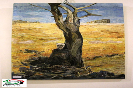 لوحة أخرى كانت مختلفة وتحمل رمزية عالية في هذه المجموعة وهي لوحة تمثل المكان التراثي مع مجموعة من الرمزيات، فشجرة الزيتون في المقدمة مرتفعة بأغصان مخضرة بأوراقها بدون كثافة، لكن جذورها تمتد على قاعدة مساحة المكان الذي يمثل وطنا يرمز له ببلدة تراثية بمبانيها، ويلاحظ في نصف المباني التراثية وجود مجموعة من الابنية تخرج بشكل مختلف عن باقي الأبنية، فهي ملونة بألوان الفرح وتختلف عن الوان وأشكال البيوت التراثية التقليدية وكأنا رمزية واشارة ان الجيل القديم يتجدد بأجيال شابة ستخلق الفرح وتزيل الالم عما سبق، وفي افق اللوحة نجد وجها لامرأة يأخذ ثلث اللوحة، ولكن من يدقق الوجه يجده يمثل جيلين، نصف الوجه شاب والآخر كهل غزته التجاعيد، وهي رمزية واضحة لانتقال القضية من جيل الى جيل وهي في الوجدان كما جذور الزيتون راسخة في الارض وممتدة للوطن بأكمله، فهي قضية لا تموت ولن تموت، والافق والسماء باللون الذي يكاد يشتعل نارا، وكأنه رمزية لافق ثورة آتية، فالنور فوق المباني وتحت الأفق باللون الأصفر الممثل لاشراقة جديدة.