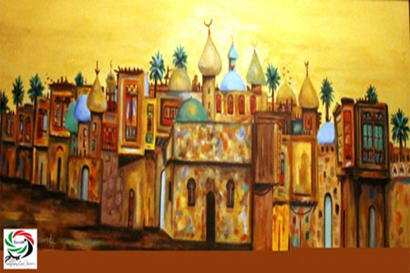حين نتناول ابداعات الفنانة عبير لا بد من تقسيم لوحاتها الى عدة مجموعات حسب الموضوعات التي تناولتها، رغم أن الفواصل بين المجموعات متداخلة بالفكرة ورمزية اللون واستخداماته، فالفكرة المشتركة في لوحات الفنانة هي العراق بتاريخه وتراثه، وإن تناولنا المجموعة الأولى فهي تدور حول لوحات التاريخ والتراث، وهي من ست لوحات، ويلاحظ ان اللوحات جميعها تناولت تراث وتاريخ العراق وروته من خلال الريشة واللون، ففي لوحة اعتمدت مساحة عرضية كبيرة أشبه بالجداريات نجد الفنانة رسمت حيا تراثيا مثلت فيه المساجد من خلال القباب والمآذن، ويلاحظ باللوحة أنها جعلت مسجدا في البداية وفي منتصف اللوحة لتتحرك بريشتها وتجعله وكأنه رأس مثلث للحي، منطلقة ببعد وعمق بصري في يمين ويسار اللوحة، وفي هذه اللوحة ركزت على تمثيل المساجد بأنماط بنائها التراثية واستخدام اللون للقباب من الأخضر الى الذهبي إلى الأخضر مع التركيز على اللون الأزرق الفيروزي، وهذا اللون تميزت به أعمال السيراميك الفنية في العراق، وهو لون يعود استخدامه من الفترة السومرية مرورا بكل الحضارات التي عرفها العراق، وصولا لمرحلة النهوض المعماري قبل الحرب ضد العراق وتدميره واعادته لمرحلة الفقر والخراب، ويلاحظ في هذه اللوحة أن الفنانة لجأت لاستخدام المباني التراثية التاريخية، فالشرفات الخشبية والشناشيل والأبواب المرتفعة القوسية من الأعلى والنوافذ الضيقة والقوسية من الأعلى بعض من تراث العراق المعماري، اضافة لتناسبه مع المناخ الحار صيفا والبارد شتاءًا، فطبيعة المناخ وقبل استخدام المكيفات لاحقا، لم تكن تسمح باستخدام النوافذ العرضية والمتسعة، ولم تترك الفنانة رمز العراق الأساسي وهو النخيل خارج الاطار، فكانت أشجار النخيل منتشرة بين الأبنية.