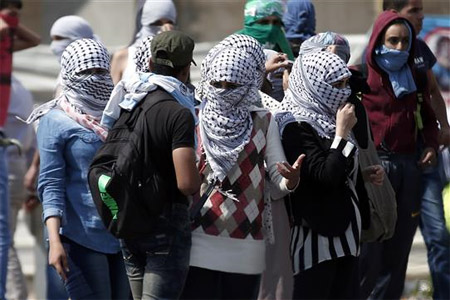 تقول طالبة في الثانوية العامة تلبس جلباباً وملثمة بالكوفية الفلسطينية، وهي تقف إلى جانب شباب يلقون الحجارة: "أهلي ما بعرفوا إني هون".