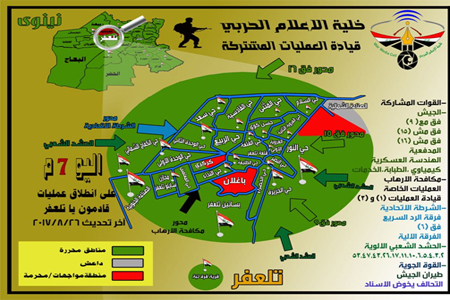 وفي وقت سابق، أعلن قائد عمليات قادمون يا تلعفر، عبد الأمير رشيد يارالله، أن الشرطة الاتحادية والحشد الشعبي يستكملان مهامهما في تلعفر، آخر معاقل "داعش" شمالي العراق.