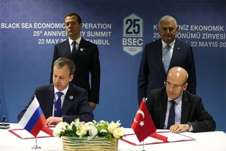 وجاء توقيع البيان المشترك على هامش مشاركة مدفيديف في قمة منظمة التعاون الاقتصادي للبحر الأسود، المنعقدة في إسطنبول بمناسبة الذكرى الـ25 لتأسيس المنظمة.
