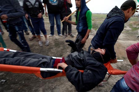 وقال الهلال الأحمر إن من بين الإصابات إصابتين بالذخيرة الحية، إحداهما في قطاع غزة وأخرى في بلدة سعير القريبة من الخليل في الضفة الغربية.