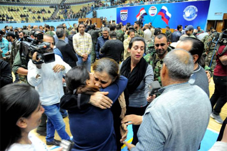 وارتفعت في صالة الفيحاء الرياضية أعلام روسية وسورية، وتجمع العشرات في ملعب كرة السلة والمدرجات حوله وأنظارهم موجهة إلى المدخل، وكلما دخل أحد المخطوفين السابقين، ارتفعت اصوات التصفيق والهتافات.