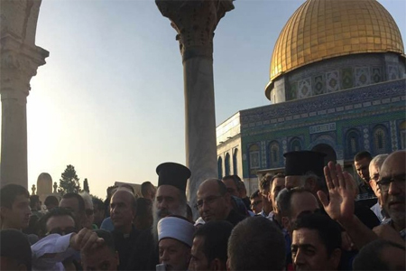 افراسيانت - شارك وفد من رجال الدين المسيحيين، عصر اليوم الجمعة، في فعاليات "جمعة الانتصار" التي أقامها الفلسطينيون في المسجد الأقصى.