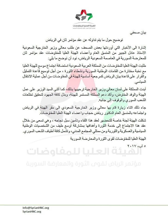 افراسيانت - طلبت الهيئة العليا للمفاوضات السورية "منصة الرياض" من المملكة العربية السعودية استضافة اجتماع للهيئة من أجل توسيع قاعدة التمثيل على أساس "بيان الرياض" كمرجعية.