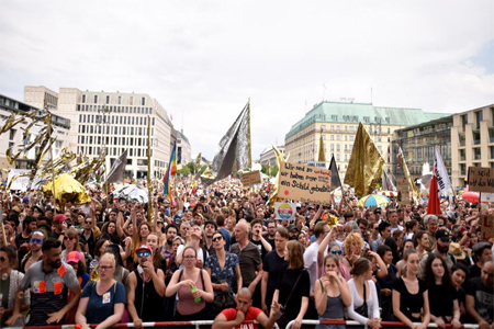 على الضفة الاخرى من نهر سبري في العاصمة الالمانية حيث مقر مجلس النواب، تجمع آلاف الناشطين النقابيين وسكان عاديين من برلين واعضاء في جمعيات او احزاب تعبيرا عن رفضهم لتظاهرة اليمين المتطرف.