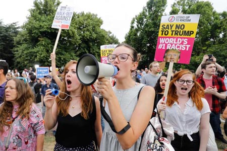 وسئل ترامب عن هذه التظاهرات قبل مغادرته الى لندن فاجاب ان البريطانيين "يحبونني كثيرا".