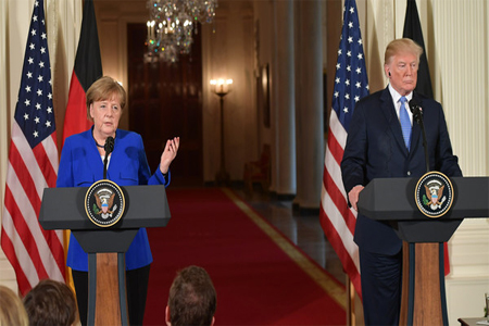 وقالت ميركل، في مؤتمر صحافي مشترك مع الرئيس الأميركي، دونالد ترمب، في واشنطن: "نعتبر الاتفاق النووي الإيراني مرحلة أولى ساهمت في إبطاء أنشطتهم على هذا الصعيد بصورة خاصة (...) لكننا نعتقد أيضاً من وجهة نظر ألمانية أن هذا غير كاف لضمان كبح طموحات إيران واحتوائها".