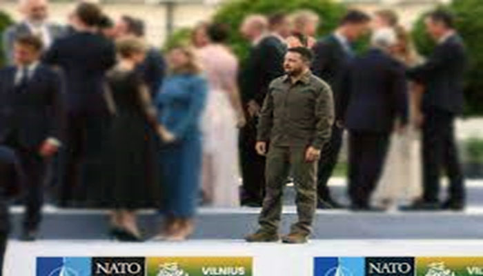 تظهر إحدى الصور المتداولة الرئيس الأوكراني وهو يقف وحيدا ممتعضا في الصورة الجماعية، بينما انشغل الموجودون بالأحاديث الجانبية، في تجاهل واضح لزيلنسكي الذي يلهث لانضمام بلاده إلى حلف “الناتو”.