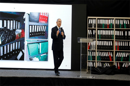 ادعى رئيس الوزراء الإسرائيلي، بنيامين نتنياهو، بأنه يمتلك «أدلة قاطعة» على وجود «برنامج سري» لدى إيران لتطوير الأسلحة النووية. وخلال مؤتمر صحافي عقده في وزارة الدفاع أمام ما سمّاه «قبواً مليئاً» بالوثائق النووية الإيرانية، التي زعم أنه «تم الحصول عليها قبيل أسابيع» (علماً بأن معظمها يعود إلى ما قبل إبرام الاتفاق النووي عام 2015)، اتهم نتنياهو إيران بـ«الكذب»، قائلاً إن «100 ألف ملف سري تثبت أن طهران تمتلك برنامجاً للأسلحة النووية»، مضيفاً أنها «واصلت الحفاظ على خبراتها المتعلقة بالأسلحة النووية، وعززتها لاستخدامها في المستقبل». كذلك، ادعى بأن إيران «أخفت مواقعها النووية عام 2017 في جنوب طهران»، معيداً التذكير بمشروع «AMAD» الإيراني، الذي يتم فيه بحسب زعمه «تصميم رؤوس نووية وإنتاجها واختبارها». وأضاف أن إيران «تُصنّع السلاح النووي لوضعه على الصواريخ الباليستية»، لافتاً إلى أن بمقدور هذه الصواريخ «الوصول إلى الرياض وموسكو وتل أبيب». ووصف نتنياهو الاتفاق النووي بأنه «قائم على الأكاذيب»، معتبراً أنه «يمنح إيران طريقاً مباشرة لترسانة نووية». وعبّر عن ثقته بأن الرئيس الأميركي، دونالد ترامب، «سيفعل الصواب في مراجعة الاتفاق».