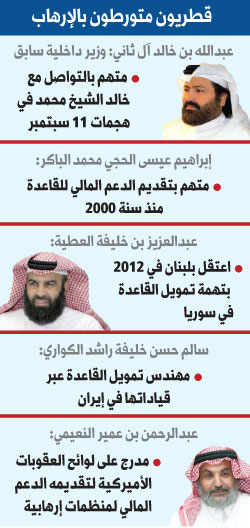 ونجد في القائمة، أيضا، القطري إبراهيم عيسى الحجي محمد الباكر المدرج على اللوائح الأميركية بتهم تتعلق بتقديمه الدعم المالي للقاعدة منذ أوائل الألفية الثالثة حين تم اعتقاله وإطلاق سراحه من قبل السلطات القطرية بعد الاتفاق على امتناعه عن القيام بأي نشاط إرهابي داخل قطر.