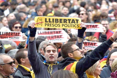 وحمل المتظاهرون لافتات كتبت عليها عبارات من قبيل “الحرية للسجناء السياسيين” ورددوا هتافات مثل “الحرية” و”تحيا كتالونيا”، ثم قاموا جميعا بترديد النشيد الوطني لكتالونيا.