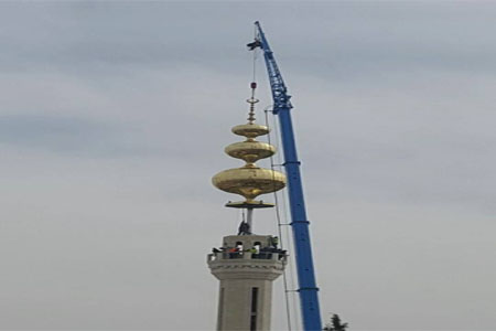 وتجمع المئات من سكان بلدة العيسوية لمتابعة تثبيت رافعة ضخمة لمئذنة ذهبية اللون على سطح مسجد الأربعين الكبير في البلدة.