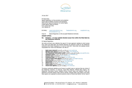 وخاطبت الكرامة و المرصد الدولي لرصد وتوثيق انتهاكات حقوق الإنسان، في 19 تموز/ يوليو 2017، المقرر الأممي الخاص المعني بتعزيز وحماية الحق في حرية الرأي والتعبير بشأن حجب تلك المواقع الإعلامية الفلسطينية من قبل السلطة وطلبت إليه التدخل لدى السلطة الفلسطينية من أجل صون حرية التعبير في الضفة الغربية.
