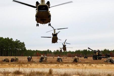 ففي فورت براغ بولاية نورث كارولاينا، نفذ سرب، يضم تشكيلا من 48 مروحية من طراز "Apache" ومروحيات من طراز "Chinook"، تدريبات على نقل القوات والمعدات خلف خطوط العدو على مرمى نيران مدفعية بالذخيرة الحية لتنفيذ هجوم على أهداف محددة.