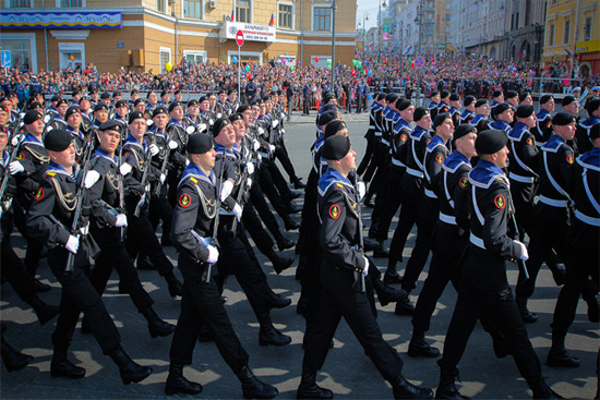 وسيقام استعراض عسكري ضخم كذلك في أقصى مدينة روسية شرقا فلاديفوستوك التي كانت ابان الحرب الوطنية العظمى موقعا استراتيجيا هاما لتموين الجيش السوفيتي بالإمدادات الواردة من الحلفاء وميناءً هاما في الحرب ضد اليابان عام 1945 . وسيشارك في الاستعراض 1300 عسكري و25 قطعة من المعدات الحربية و10 طائرات حربية تابعة للمنطقة العسكرية الشرقية.