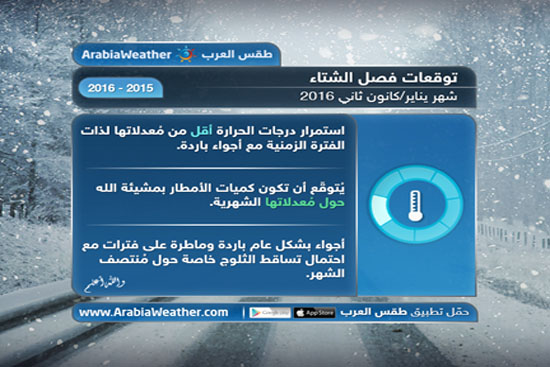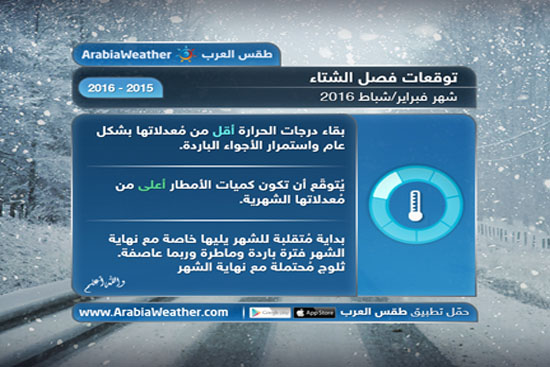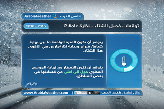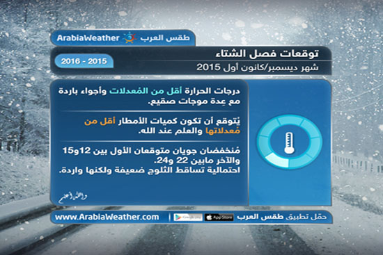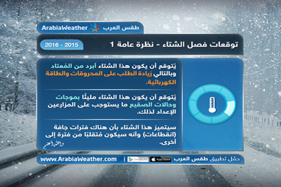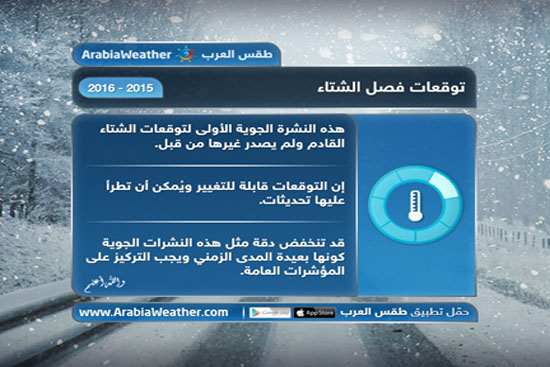 افراسيانت - موقع ArabiaWeather.com - يُقدّم لكُم "طقس العرب" توقُعاته الموسمية لفصل الشتاء 2015/2016، علماً بأن هذه النشرة الصادرة الآن هي التحديث الأول فحسب، حيثُ أن التوقعات الموسمية قابلة للتغيير وسيتم إصدار عدّة تحديثات إن اقتضي الأمر، وينوه طقس العرب على انخفاض دقّة مثل هذه النشرات الجويّة بفعل طول الفترة الزمنية التي تشملها.