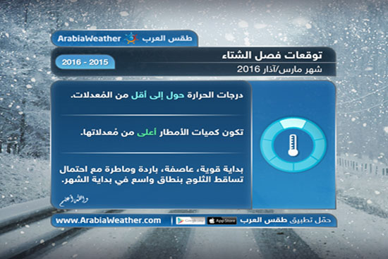 3. أجواء بشكل عام باردة وماطرة على فترات مع احتمال تساقط الثلوج خاصة حول منتصف الشهر.