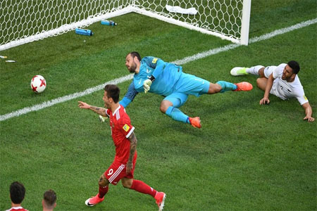 وجاءت باكورة أهداف روسيا في تاريخ البطولة، بـ "نيران صديقة"، سجله النيوزيلندي، ميشائيل بوكسال، خطأ في مرماه، من متابعة لكرة طالت على الروسي، دينيس غلوشاكوف، الذي بات يعرف بـ "القبر"، بسبب أهدافه القاتلة مع فريقه سبارتاك موسكو، بعد انفراده ومراوغته لحارس المرمى، في الدقيقة 31، من زمن الشوط الأول.