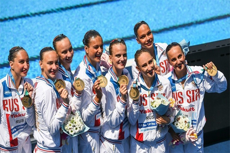وسبق لفريق سيدات روسيا التتويج بذهبية البرنامج الفني للسباحة الإيقاعية "التزامنية"، منذ ثلاثة أيام، وبذلك يكون قد حصد ذهبيتي الفرق للبرنامجين (الفني والاختياري).