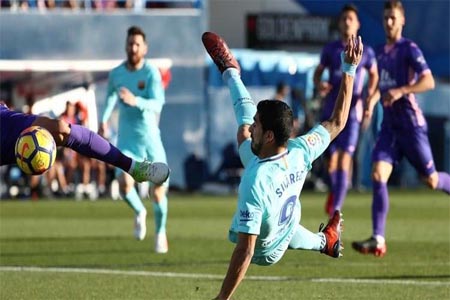 افراسيانت - قاد الأوروغوياني لويس سواريز، مهاجم برشلونة، فريقه إلى الفوز على مضيفه ليغانيس (3-0)، في اللقاء الذي جمعهما، امس، ضمن منافسات الجولة الـ 12 من الدوري الإسباني لكرة القدم.