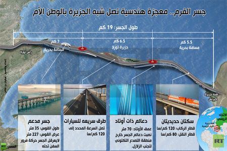 ويمتد الجسر، الذي يبلغ طوله 19 كم، فوق مضيق كيرتش، الذي يربط بحر آزوف بالبحر الأسود، ليتيح حركة مرور السيارات والقطارات بين روسيا وشبه الجزيرة، التي عادت إلى قوام روسيا بموجب استفتاء شعبي حاشد سنة 2014.