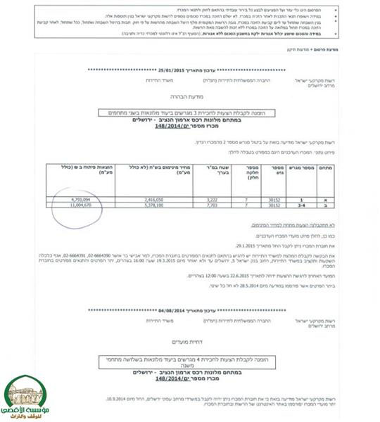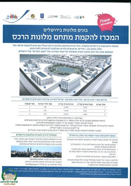 ونهاية الشهر السابق، تمّت الدعوة إلى مناقصة أولية لبناء ثلاثة فنادق بسعة 580 غرفة، بدعم وتحفيز غير مسبوق من قبل وزارة السياحة الاسرائيلية، وما يسمى بـ "دائرة أراضي إسرائيل"، و"الشركة الوطنية السياحية"، وبلدية القدس المحتلة والتي تتبنى وتشارك في المشروع.