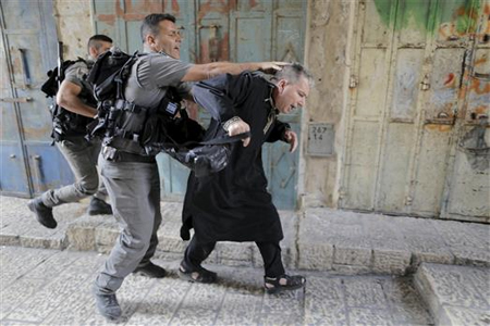 واعتدى عناصر الاحتلال على المصورين الصحافيين. وقام شرطي بملاحقة أحد المصورين ودفعه أرضا وانهال عليه ضربا بعصاه على ظهره وساقيه، فيما قام آخرون باعتقال تسعة أشخاص داخل باحة المسجد وفي شوارع البلدة القديمة.